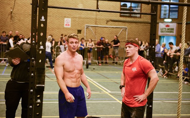 We broke these into sets of 10 and then the same person lunged back. Team Little and Large next to us went 20 unbroken back squats before swapping, which only made us more pumped to try and catch them with our strategy. After lunging back we started the first set of synchro burpees over the bar. As you’d expect Sam set the pace and I tried to keep up for the first five until I settled into a rhythm after the lunges. Sam did the lunges on the second round and I waited ready for the back squats at the rig and did my set of 10 followed by a set of 12 before Sam lunged back. By this point, we were both dead, but I managed to get into an early rhythm and drag Sam through the last 20 synchro burpees. We finished but knew pain was to follow on the next part of workout three.